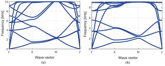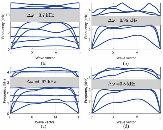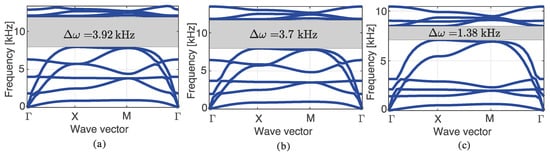 The band diagrams are shown in Figure 14, in which the frequencies are presented as a function of the wave vector. It is evident that when the mass increases, the mean bandgap frequency decreases. To clearly show the bandgap obtained in the sandwich configuration with and , only six bands were plotted. In all the other cases, the number of bands was 10. The aforementioned bandgap is the smallest of all obtained bandgaps because it is tuned in a lower frequency; however, its mean bandgap frequency is similar to the other bandgaps.