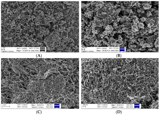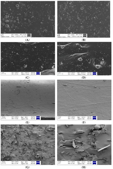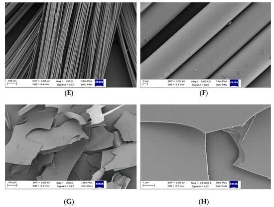 SEM photos: (A,B)—graphene flakes; (C,D)—carbon nanotubes; (E,F)—basalt fibers (BFS); (G,H)—basalt flakes (BFL).