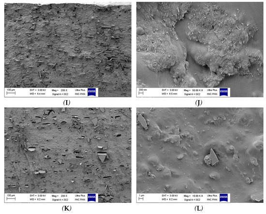 SEM photos of EPDM rubber composites. (A,B)—graphene flakes; (C,D)—carbon nanotubes; (E,F)—basalt fibers (BFS); (G,H)—basalt flakes (BFL); (I,J)—BFS and CNTs; (K,L)—graphene flakes and BFL.