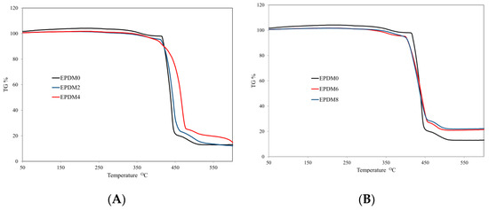The addition of carbon fillers in the form of nonexpanding graphite (GnP) or carbon nanotubes (CNTs) did not affect the thermal transitions of the cured EPDM rubber. Both the unfilled and carbon-filled crosslinked EPDM rubbers were characterized by distinct one-stage thermal decomposition, occurring in the temperature range ΔT = 415–460 °C (Figure 3A,D).