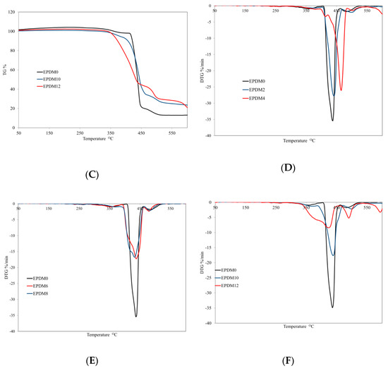 Thermogravimetric analysis data obtained for EPDM-filled composites: (A–C) TG curves and (D–F) DTG curves.