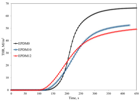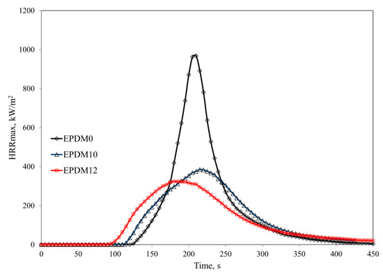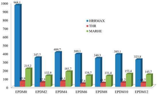 The increased thermal stability of the studied EPDM rubber composites reduced their flammability. Comparative analysis of the results of both PCFC (pyrolysis combustion flow calorimetry) and cone calorimetry clearly shows that the composites had lower flammability in comparison with the reference composite (EPDM0) (Parameters HRR and THR, Table 3).