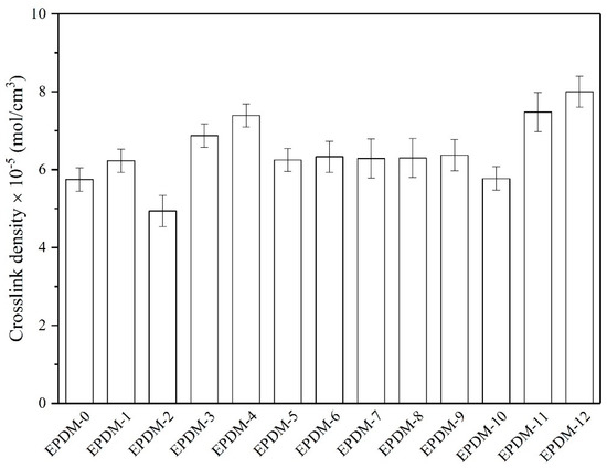 The basalt fillers had no obvious influence on the crosslink density of the EPDM composites. The application of mixture composed of basalt fillers with carbon nanofillers resulted in a marked improvement in this parameter (Figure 7). This accelerating effect may be due to the very high thermal conductivity of GnP and CNT nanofillers, which favored heat transfer during the curing process [39].