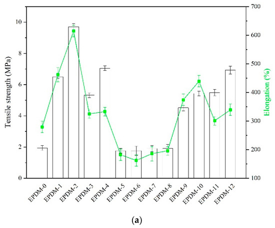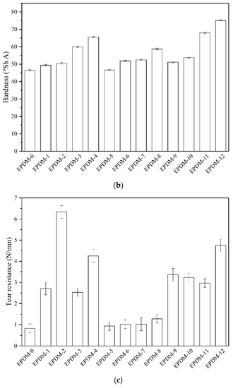 Mechanical performance of the EPDM composites: (a) tensile properties; (b) hardness; (c) tear resistance.
