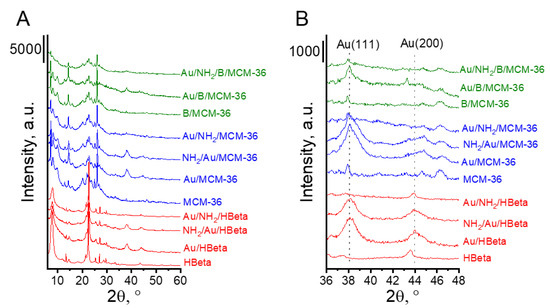 The presence of metallic gold in the samples studied was confirmed by all techniques used. The diffraction peaks at 2θ = 8.2° and 44.4°, typical of metallic gold [29], were found in the XRD patterns of gold-containing zeolites after calcination (Au/HBeta, Au/MCM-36, Au/B/MCM-36) and the calcined samples further modified with the amino-organosilane (NH2/Au/HBeta and NH2/Au/MCM-36) (Figure 1B). In the XRD patterns of gold non-calcined zeolites functionalized with APMS and modified with gold (Au/NH2/HBeta, Au/NH2/MCM-36, Au/NH2/B/MCM-36) the reflections corresponding to metallic gold were not detected, suggesting the presence of very small gold crystallites.