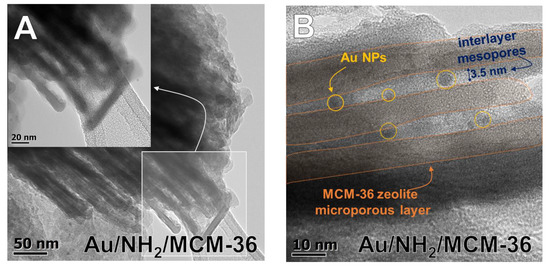 (A) An exemplary HR-TEM image indicating layered structure of MCM-36 support; (B) HR-TEM image presenting Au NPs location in interlayer spaces of MCM-36 support.
