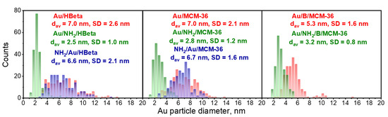 To confirm the above suggestions, HR-TEM images were taken. They allowed us to get the information about the shape of gold crystallites, average gold particle size and distribution of Au NPs on the surface of zeolites, depending on the preparation conditions. Spherical metallic gold nanoparticles (NPs) were well visible in the HR-TEM images of all gold catalysts (Figure 2). In the MCM-36 structure, gold was localized in mesopores between zeolites layers (Figure 3). The average size of gold particles is shown in Table 1 and the Au NPs distributions histograms, plotted on the basis of HR-TEM images, are shown in Figure 4. The influence of calcination process after functionalization of zeolite with APMS and gold introduction is clearly seen. Gold particles on the surface of calcined catalysts (Au/HBeta, Au/MCM-36, Au/B/MCM-36) were much larger (dav = 5–7 nm) than the particles on non-calcined gold-catalysts containing APMS (Au/NH2/HBeta, Au/NH2/MCM-36, Au/NH2/B/MCM-36) (dav = 2.5–3.5 nm) indicating that Au agglomeration took place during calcination. The difference between both kinds of samples is well visible in histograms. They show a wide Au NPs size distribution for the calcined samples (the particles diameter oscillates between 3 and 12 nm) and clearly narrower particle size distribution for the non-calcined zeolites prepared without calcination (between 1–6 nm). The results obtained are consistent with the literature data [30] which demonstrated a similar narrow particle size distribution for Pd NPs loaded on silica functionalized with APMS. The treatment of calcined samples with APMS did not change significantly the size of gold particles.