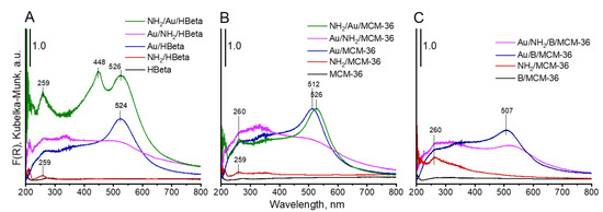 UV-vis spectroscopy was used as the next complementary technique for gold characterization. The UV-vis spectra of all Au-containing samples show the characteristic surface plasmon resonance (SPR) band at ca 500 nm, typical of metallic gold [31] (Figure 5). However, the differences in intensity of the SPR band are observed, depending on gold-zeolite composition and preparation procedure. It is known from literature [32,33] that the intensity of SPR band is related to the diameter of gold nanoparticles. The intensity of the band increases with increasing size of metal particles. The small intensity of the band at around 512–520 nm, observed in the spectra of non-calcined catalysts in comparison to that of the analogous band in the spectra of calcined samples, indicates the presence of very small gold crystallites in Au/NH2/HBeta and Au/NH2/MCM-36. Similar intensities of the band at around 520 nm in the UV-vis spectra of calcined gold-zeolites and that in the spectra of calcined gold-zeolites further treated with APMS, indicate that the introduction of amino-organosilane after sample calcination did not influence the size of metal particles. These results are in line with the results of XRD study and TEM measurements. However, it is important to note that the presence of organosilane (APMS) in zeolites leads to the appearance of new bands in the UV-vis spectra. Two bands at ca 200 and 260 nm are characteristic of amine species [34,35,36]. Moreover, an additional band at 448 nm is visible in the spectrum of NH2/Au/HBeta. The appearance of a secondary peak in the UV-vis spectrum at a shorter wavelength relative to the typical gold SPR band position was observed earlier for gold core–mesoporous silica shell nanoparticles (Au-MMS-rods) [37]. On the other hand, it has been documented that gold nanospheres show one absorption peak in the UV-vis spectrum, while nanorods show two characteristic absorption peaks due to transverse plasmon resonance and longitudinal plasmon resonance [37]. That is why, in the case of zeolites with spherical particles, the presence of the secondary band cannot be related to transverse/longitudinal SPR and should be a result of amino-organosilane localization in the vicinity of gold. The SPR band is sensitive to dielectric properties of the environment in the vicinity of the illuminated nanoparticle. Changes in the environment of the nanoparticle cause a shift in the maximum of the plasmon absorption band. Taking into account that the secondary band in the shorter wavelength region is not present in the spectrum of NH2/Au/MCM-36, one can suggest the presence of gold particles in two different surroundings only on the surface of NH2/Au/HBeta. Most probably on the surface of NH2/Au/HBeta zeolite, APMS anchors to the hydroxyls which are close to gold and that is why amino-organosilanes are in very close proximity to gold changing dielectric properties of gold environment (the SPR band at 448 nm). In the layered and pillared MCM-36, gold is preferentially localized in mesopores (between zeolite layers) and APMS is anchored to hydroxyl groups relatively away from the gold. As a result, only one Au SPR band at ca 520 nm is visible in the spectra of NH2/Au/MCM-36.
