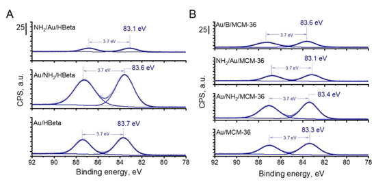 The presence of metallic gold particles on the surface of all catalysts was further confirmed by X-ray photoelectron spectroscopy. The XPS spectra of gold zeolites based on HBeta and MCM-36 are compared in Figure 6. In all Au 4f spectra, two components separated by 3.7 eV, namely Au 4f7/2 and Au 4f5/2, were identified. According to literature [38], the Au 4f7/2 peak of metallic gold species corresponds to the binding energy value of 84.0 eV. Interestingly, for all materials prepared in this study, the binding energy corresponding to the Au 4f7/2 peak was lower than 84.0 eV, indicating that in all the samples the gold species were present in metallic form on whose surface negative charge was accumulated [39]. The higher the BE shift towards lower binding energy value of Au 4f7/2, the higher the negative charge accumulated on the surface of metallic gold species [39]. From among all calcined gold catalysts, the lowest BE of Au NPs was observed for Au/MCM-36 catalyst (BE = 83.3 eV; Figure 6). For Au/B/MCM-36 and Au/HBeta the BE of Au NPs was slightly higher and took the values of 83.6 and 83.7 eV, respectively. As far as the electronic properties of gold species are concerned, it is important to underline that Au NPs in the non-calcined gold catalysts were characterized by similar binding energy values as those determined for the calcined samples. Thus, in view of this observation, one can conclude that the presence of amine group has no significant impact on the electronic properties of gold species. Interestingly, in the calcined gold catalysts modified with amino-organosilane, the binding energy of gold species was the lowest from among all materials synthesized in this work, suggesting the presence of strong electronic interaction between the amino-organosilane and Au NPs. Thus, these results show the difference between the amine species on gold zeolites calcined prior to modification with APMS and those on the non-calcined (containing amino-organosilane) samples.