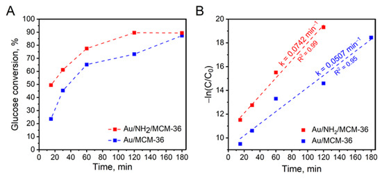To get a deeper insight into glucose oxidation over the most active gold catalysts supported on MCM-36 zeolite, kinetic measurements were performed. Figure 7A shows glucose conversion over Au/MCM-36 and Au/NH2/MCM-36 samples as a function of reaction time. It was found that the non-calcined catalyst, irrespectively of the reaction time, exhibited significantly higher glucose conversion than that observed for the calcined one. As can be seen from Figure 7A, Au/NH2/MCM-36 reached the reaction equilibrium after 120 min, while the same glucose conversion over Au/MCM-36 was observed 60 min later, i.e., after 180 min of the reaction. To shed more light onto the kinetics of glucose oxidation over gold catalysts supported on MCM-36, the experimental data were fitted to pseudo-first order kinetic model (see Figure 7B). It was found that the experimental data obtained for the catalysts fit in within this model. For the reactions with the use of Au/MCM-36 and Au/NH2/MCM-36, the R2 values were higher than 0.95 (see Figure 7B). The highest reaction rate constant of 0.0742 min−1 was observed for Au/NH2/MCM-36 sample, and was ca 1.5 times higher than that estimated for Au/MCM-36.