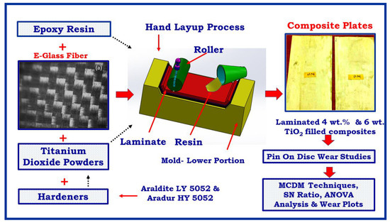 Sarkar et al. [6] examined tribological (sliding) wear of woven glass epoxy composites packed with Aluminum granular. Among the different wt% (5, 10, 15, and 20 wt%) of Al powder, the 5 wt% Al filled composite acquiesces less friction coefficient and better wear resistance. Fillers are added to both thermoplastic [7,8,9,10] and thermosetting [11,12,13,14,15,16] resins to progress the mechanical characteristics, as well as tribological characteristics, of the composites. Characterization of TiO2 filled epoxy composites under sliding wear has been executed by Siddhartha et al. [17]. In their research, an experimental approach, based on Taguchi’s parameter design, was employed to evaluate the outcome of different factors and their relations.