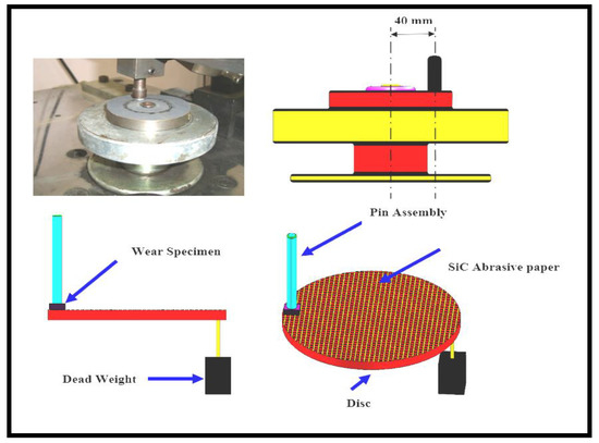 The two-body abrasive wear performance of the fabricated composites was tested by using a pin-on-disc machine as per ASTM-G99 standard. The required specimen of 5 mm × 5 mm × 2.8 mm pasted to a pin having cylindrical shape. The pin is having Ø10 mm and 25 mm height, which is mentioned in Figure 2. To make abrasive contact, the pin makes contact with the SiC abrasive paper coated disc. Once the test completed, the abraded SiC paper was removed. For the next test new SiC paper was stuck to the disc. The pin having specimen was located on a path of Ø 20 mm in the disc. The details of the machine and sample are illustrated in Figure 2. The test was conducted by changing a different load of 5, 10, and 15 N at 200 rpm. For all the tests, abrading distances of, 25, 50 and 75 m were chosen to determine the wear resistance under multi-pass conditions. To remove the dust and unwanted particles from specimen, it is cleaned with acetone on the surface and dried for a few minutes. To determine the wear loss, initial and final weights are noted by means of an electronic weighing balance. Average values of the tested specimens are mentioned in the results. All the mechanical tests of the composites were conducted as per the ASTM standards. Figure 2 indicates the image of two body abrasive wear set up.