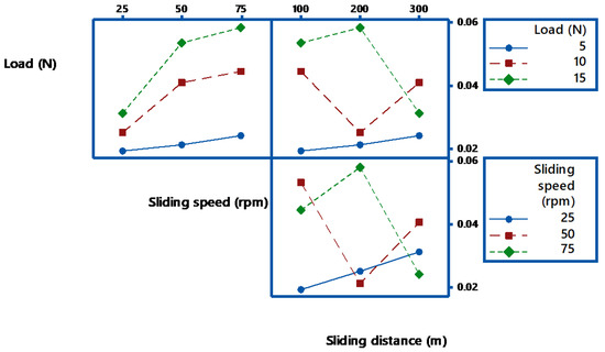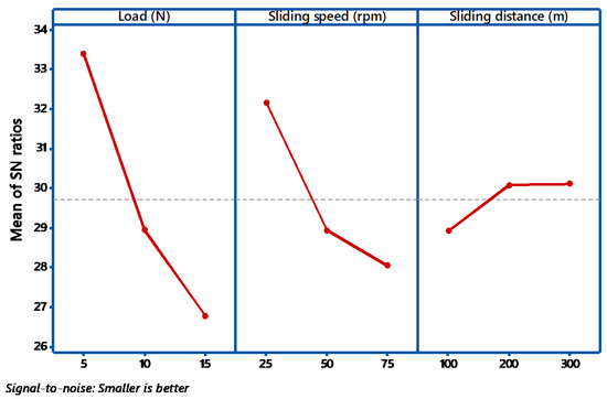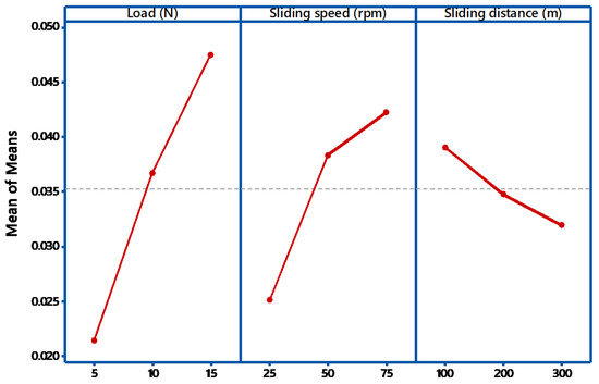 The S/N ratio on the wear loss during abrasive wear is exposed in Figure 3. It shows how the Signal to Noise ratios are employed to calculate the main effects, in addition to the estimated performance, at the most favorable state. During the abrasive wear test, if there is a little alteration in the parameter, then it has a direct control on the wear behavior. All the three factors have minimum value say 25 for load and 75 for speed. If the observed graph is horizontal, then the factor is less significant. In this case from Figure 3 and Figure 4, all the graphs are not nearly horizontal. In the main effects plot for S/N ratios, the mean of S/N ratios for each factor category is plotted against the test level for each factor. A horizontal dotted line is drawn for all the graphs of the main effect. From ANOVA analysis, if the angle of inclination is more, with respect to the reference, then that factor has considered to be most significant [30]. From the Figure 3, it is examined that load factor has the maximum inclination compared to other factors. Similarly, if there is less inclination, then it has very slight significance, so in our case, the sliding speed has slight significance. If the curve is almost parallel to the reference line, then it indicates no significance. From the plot, it is clearly identified that sliding speed has no noteworthy effect on the weight loss of the composites. From the main effects plot, it is perceived that applied load has a significant influence on wear, followed by sliding speed and sliding distance. Similar results were obtained by Nayak et al. [31]. In evaluating the result at the most favorable circumstance, the factors responsible for the significant contributions are incorporated. From the results obtained, load dominates the rank 1, followed by sliding speed and sliding distance.