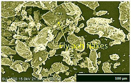 The micrographic images of fly ash flakes and SiC are observed using a Hitachi make SU-8000 SEM and their microstructural images are obtained at 500× magnification and 15 kV acceleration voltage. The size of fly ash flakes varies in the range of 45–125 µm (Figure 1), whereas the size of SiC varies in the range of 30–85 µm (Figure 2).