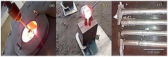 The stir casting was accomplished to fabricate AA 5083-SiC-fly ash composites because of their capability to deliver high-performance composites. The weighed amount of cut pieces of aluminium AA 5083 were fed into the furnace, and the temperature was raised to 770 °C, following the works of Santhosh et al. [32,33]. The SiC and fly ash flakes were preheated to 350 °C for two and a half hours, added to the molten metal, and stirred using ceramic coated AISI 316L stirrer for a duration of 10 min at a speed of 600 rpm. Hexachloro–ethane (C2Cl6) tablets were plunged into the molten metal to remove the entrapped air. Subsequently, the temperature of molten metal was sustained at 750 °C, followed by a second round of stirring ceaselessly for a duration of 10 min before pouring the melt to the preheated die. The stir cast composites with varying wt.% of SiC and fly ash were subjected to varying temperatures, i.e., 40 °C, 80 °C, 120 °C, 160 °C, and 200 °C. The photographic images of the stir casting process, pouring of molten metal into the die-set, and cast specimens are given in Figure 3.