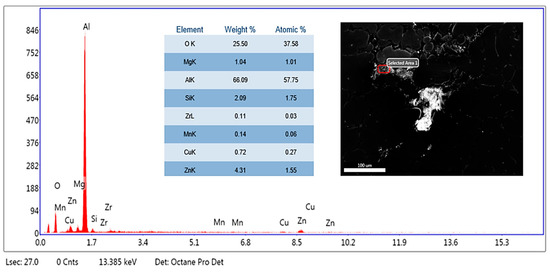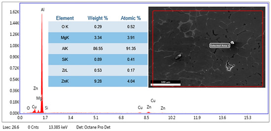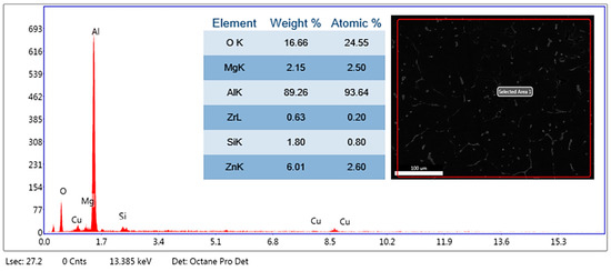 The microstructural evaluation of the specimens was accomplished using a Hitachi make SU-8000 series SEM (Tokyo, Japan) available at the University Visvesvaraya College of Engineering, Bangalore University, Bengaluru, Karnataka State, India, with a scanning electron voltage of 15 keV at magnifications of 500× to study the particle distribution of the reinforcements in the matrix; in addition, the elemental analysis from the energy dispersive spectrum was performed using the silicon drift detector with the detection area of 100 mm2 to substantiate the findings by evaluating the presence of reinforcements. The SEM image depicts particle distribution in the matrix phase, while the EDS gives the elemental point analysis to significantly understand the homogenous dispersion of the SiC and fly ash flakes in the matrix facilitated by stir casting and thermal treatment.