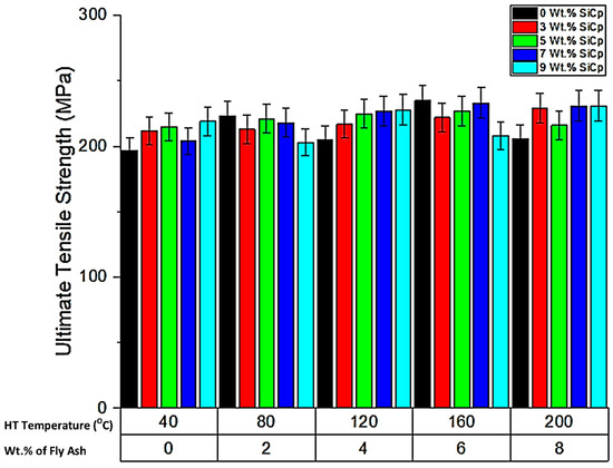 The comparative evaluation of the ultimate tensile strength of the composite specimens for different compositions of the reinforcements and heat treatment temperatures is given in Figure 9, Figure 10, Figure 11 and Figure 12. From the graph (Figure 9), it is evident that the ultimate tensile strength of the composites increases with the increase in the wt.% of fly ash due to inoculation accelerated by the thermal exposure of the composites in the post-treatment condition up to a temperature of 160 °C, as ascertained by the findings of the Kumar et al. [36], who reported the findings related to the influence of fly ash reinforcements on the tensile strength of Al/3Cu/8.5Si and drew similar inferences of increase in the strength with the increase in wt.% of fly ash attributed to close packing of the reinforcements in the matrix. However, the increase in the thermal exposure temperature to 200 °C leads to a slight decrease in the ultimate tensile strength which can be attributed to the agglomeration of the reinforcements at certain regions in the matrix at an elevated temperature of exposure, as reported in the findings of Kok et al. [37] about the effect of thermal exposure on the Al2O3 particle dispersions in the matrix; the Al2O3 particles dispersed in the matrix phase and exposed to a temperature of 150 °C had better strength characteristics, as compared to those aluminium composites with Al2O3 particle dispersions in the matrix subjected to a temperature above 150 °C which is in line with the findings of the present work.
