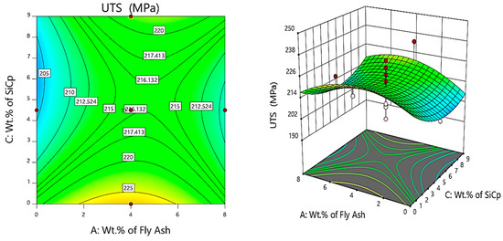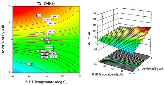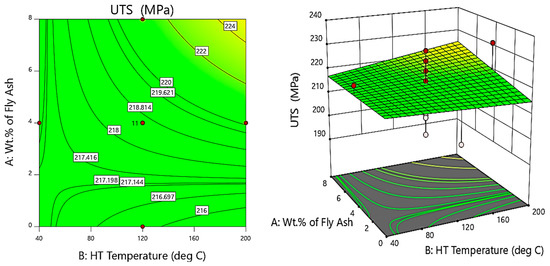 Further, Figure 12 shows the contour and 3D surface plots for the variation of the ultimate tensile strength (MPa) with heat treatment and wt.% of fly ash. From the plots, it is evident that the ultimate tensile strength is maximum for composite specimens with 6 wt.% of fly ash, exposed to a treatment temperature of 160 °C, i.e., the composite specimens after successful heat treatment, especially after T6-grade treatment and thermal exposure at a temperature of 160 °C, will form strong bonds between the Al atoms and the silicates present in the fly ash. It is, therefore, evident from the graphs that the ultimate tensile strength is dependent on the wt.% of fly ash and the heat treatment temperature [39].