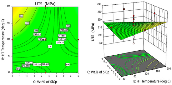 The influence of heat treatment on the strength of these composites is of significant importance to enhance the characteristics of the composites for real-time engineering applications. In this regard, the contour plots and surface plots help us to understand the influence of heat treatment on the ultimate tensile strength of the composite materials. The contour and 3D surface plots in Figure 11 give the variation of the ultimate tensile strength (MPa) with heat treatment and wt.% of SiC. From the 3 D surface and contour plots, it is evident that the ultimate tensile strength is maximum for composite specimens with 9 wt.% of SiC, exposed to a treatment temperature of 160 °C, i.e., the specimens after successful heat treatment, especially after T6-grade treatment and thermal exposure for a duration of 24 h in oven conditions at 160 °C, will form strong bonds with enhanced toughness, owing to micro coring and granular segregations.