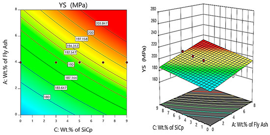 Further, the contour and 3D surface plots (Figure 9) depict that the inoculation brought about by the fly ash reinforcements will enhance the strength of the composites, due to the strong bonding and inherent coring of the reinforcements with the matrix brought about by the thermal exposure. The inferences are based on those of Gireesh et al. [38], who reported an increase of the tensile strength of the Al 6061 reinforced with SiC and Al2O3 by 8.5%, while an increase in yield strength by 36.8% mainly due to the adhesive bonding between the matrix and reinforcements attributed to uniform mixing and distribution of the reinforcements.