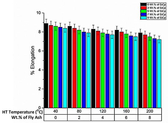The comparative evaluation of the % elongation of the composite specimens for different heat treatment temperatures is interpreted from the graph (Figure 17). From the graph, it is evident that the % elongation of the composites decreases with the increase in the wt.% of SiC and fly ash and the heat treatment temperature, mainly attributed to the coherent bonding and interstitial micro coring and increase in the stiffness of the material. This is also supported by the inferences of Florián-Algarín et al. [44], who concluded that, as the strength increases, the elongation decreases; this is due to the fact that the increase in strength, especially the increase in ultimate tensile strength, yields in increased strength, and Young’s modulus significantly increases the stiffness of the material, thereby decreasing the tenacity related to the % elongation (ductility). However, at the thermal exposure temperature of 160 °C, there is a slight increase in the % elongation, due to the critical softening of the material occurring consequent to the thermal deformation, beyond which the % elongation decreases due to embrittlement accelerated by the strain hardening, as noted in the works of Lu et al. [45] on the influence of hard ceramic reinforcements in enhancing the mechanical strength of the composite materials. They studied the impact of reinforcements in enhancing the damping characteristics of the composite materials, especially attributed to the synthesis of composites in controlled environments.