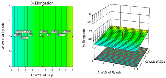 Contour plot for variation of % elongation with varying wt.% of fly ash and SiC.