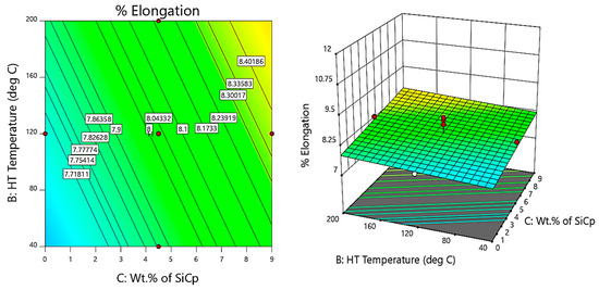 Further, the contour and 3D surface plots (Figure 18, Figure 19 and Figure 20) depict that the inclusion of the reinforcements reduces the ductility of the composites due to the strong bonding facilitated by the inclusion of reinforcements that leads to the process of precipitation hardening, accelerated by the heat treatment, i.e., as the temperature of thermal exposure increases, the hardness and strength of the composites increase due to micro coring and interstitial bonding, while the ductility decreases due to embrittlement and crack initiation and rapid propagation along the 45° plane. Although the ductility decreases with heat treatment up to 160 °C, the % elongation at 160 °C slightly increases with the slightest improvement in ductility, due to thermomechanical softening and easy deformation [46].