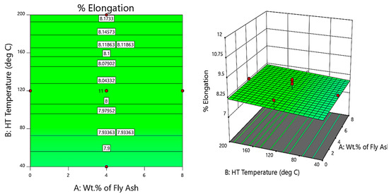 Contour and 3D Surface plots for variation of % elongation with varying wt.% of fly ash and HT temperature.