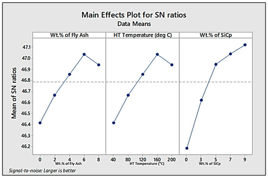 From the response tables and main-effect plots for S/N Ratios and means, it is evident that the wt.% of SiC has a major influence on the UTS, followed by the wt.% of fly ash and heat treatment temperature. Among these factors, level 4 (6 wt.%) for fly ash and level 4 (160 °C) for HT temperature are found to be the optimised set of parameters for maximising the UTS, while the inclusion of silicon carbide in the increments of 2 wt.% is found to outrightly improve the UTS, beginning from 3 wt.% up to the maximum limit of 9 wt.% chosen for the present work.