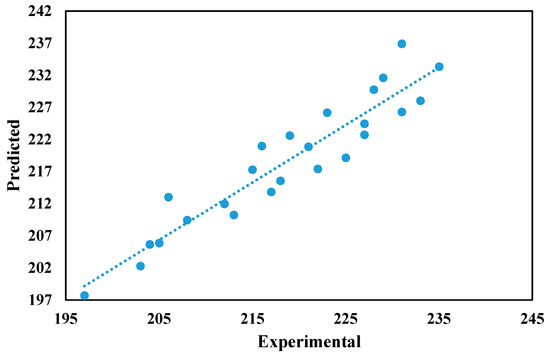 The ANN used 520 experimental results, split into 3 segments: the training set (65% data), the test set (25% data), and the validation set (10% data). The importance of determining the best ANN architecture is critical because it has a significant impact on the results [50,51,52]. The optimisation of ANN variables is achieved by minimising the mean square error (MSE) after examining a large number of distinctly configured neural networks [53]. The appropriate ANN framework that was chosen in this analysis has 30 neurons in the hidden layer for the prediction of UTS as shown in Figure 24. A tangent sigmoid transfer feature operates in the hidden layer [54,55,56]. A linear transfer function and the ‘Levenberg–Marquardt’ learning algorithm are used in the output layer [57,58]. In Table 8, the correlation coefficient of ANN models is shown for testing, training, and validation data. The test data were compared to the expected UTS data obtained from ANN (Figure 25, Table 9). As can be seen, ANN’s estimation of the results is significantly better.