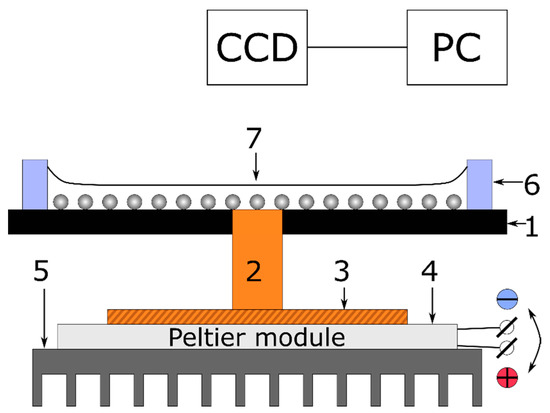 Sketch of the experimental setup for studying the formation of the ring-shaped deposit: 1—glass substrate, 2—copper rod, 3—copper plate, 4—Peltier module, 5—aluminum radiator, 6—polymeric ring, wall of the fluidic cell, 7—polystyrene particles on the substrate covered with a liquid layer.