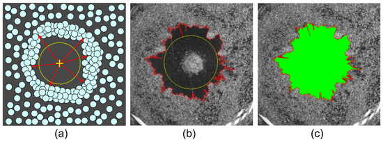 The deposit area and the area of substrate cleared from particles were measured by counting the corresponding pixels. The boundary of the area covered by particles was determined by the pixel intensity gradient in the sequence of images. The external boundary of the deposit was defined as the transition from high to low level of intensity, and the cleared area boundary—from low to high intensity, respectively. Images were processed using an in-house-developed computer program, which allowed calculating the area of the particle deposit and the area cleared from particles. The program contains a number of tools to exclude random and systematic errors in calculating the area. As an example, the procedure for the calculation of the area cleared from particles (the inner area) is schematically shown in Figure 2. Since the heater in images stands out against the substrate background, to prevent it from counting in the calculation, its area is blocked by a circle, Figure 2a. After the unknown area was calculated, the heater circle was taken into account, to avoid underestimation of the final area. A reference point (shown by a yellow cross sign) was set on the image center. Then, lines were drawn from this point (red arrows in Figure 2a) in all directions with an angular separation of 0.25° to enable measuring the boundary of the inner area in detail in images with a resolution of 1920 × 1200 pixels. The length of each line was determined by the particle closest to the heater. The contour of the inner area was interpolated using the array of boundary coordinates (Figure 2b, red outline), and then the area enclosed by that boundary was calculated (Figure 2c, indicated in green). The area bounded by the outer contour of the ring-shaped deposit, , was measured in a similar way. The resulting area of the ring-shaped deposit was calculated as follows .