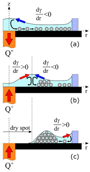 where is the thermocapillary equation, is the thermal coefficient of surface tension, is the radial temperature gradient, is the viscosity of liquid, is the horizontal component of the flow velocity, and is the vertical gradient of the flow velocity. Due to the local cooling, the temperature gradient is positive, 0, and that produces a negative surface tension gradient, 0, hence the radially-inward thermocapillary flow along the free surface layer arises. As a result, the liquid elevates above the heat sink and forms a hill. The capillary pressure under the surface of the hill increases and causes the liquid to flow near the substrate from the heat sink. This flow is called an outward-directed bottom flow. Eventually both the flow along the free surface and the bottom flow couple and form the toroidal thermocapillary vortex in the layer. The particles sitting on the substrate exert the action of a drag force, which is caused by the viscous friction of the liquid. Under the action of the Stokes force, particles are transferred to the warm periphery and, as a result, the cooled surface becomes free from particles (Figure 3a).
