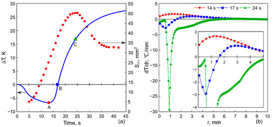 To demonstrate the formation of the inner contour of the ring-shaped deposit, Figure 4a shows the evolutions of and obtained with an electrical power 5 W applied to the Peltier module and a cooling time span 10 s, and Figure 4b shows the radial temperature gradients corresponding to the moments in time t = 14, 17 and 24 s. As can be seen in Figure 4, the inner area grows not only at the cooling stage but also during the first few seconds of heating. The reason for that effect is the following. After the cooling stage is finished, the voltage polarity on the Peltier module is changed, but due to the inertia of the heat transfer process the temperature of the rod continues to decrease slightly for another 2–3 s and reaches the minimum value −7 °C for the specified power 5 W (Figure 4a, the point A). At this moment, the temperature gradient along the layer is positive, 0 (Figure 4b). This supports the negative surface tension gradient, 0 responsible for the transfer of the particles away from the center and the growth of (Figure 4a). Then, in the course of heating, the temperature of the heater increases and reaches the value , i.e., 0 at 17 s (Figure 4a, the point B). As a result, the local temperature gradient, 0, is established in a zone extending from the heater center to the distance of 1.7 mm (Figure 4b, insert). In the heating zone, the surface tension decreases according to Equation (1), resulting in a positive gradient 0, which leads to a change in the rotating direction of the thermocapillary vortex and the formation of a thermocapillary concave deformation (Figure 3b). At the same time, at the periphery, the positive gradient 0 still exists (Figure 4b); therefore, the particles continue to move away from the center increasing the area . For the case depicted in Figure 4, the positive gradient 0 holds on near the wall of the cell for quite a long time until the temperature of the heater rises up to 15 °C. Such inertia in the changing of the thermal gradient sign is attributed to the large thermal resistance at the interface between the rod ( 400 W/(m × K)—thermal conductivity) and the glass substrate ( 0.748 W/(m × K)), which delays the heat flow into the glass substrate. Therefore, the heat transfer from the heater surface at the beginning of heating is supported mainly by the convective heat transfer in the liquid. Moreover, the thermal diffusion in the glass substrate is a very long process; the diffusive relaxation time 250 s, where 10 mm and 4 × 10−7 m2/s is the thermal diffusivity of the glass.
