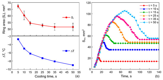 Figure 5a shows the ring-shaped deposit area, , and the temperature drop on the heat sink, , as functions of the cooling time spans at the constant cooling power 1.2 W. Figure 5b shows the evolution of the inner area, , of the ring-shaped deposit for several values of the cooling time spans at 1.2 W.