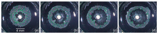 Optical images (top view) of the ring deposits of microparticles obtained at different cooling time spans and the corresponding values of on the rod for 1.2 W: (a) 5 s, −3.1 °C; (b) 10 s, −4.7 °C; (c) 15 s, −6.1 °C; (d) 50 s, −9 °C.