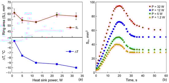 Figure 7a shows and on the heat sink as a function of the cooling power at 10 s, and Figure 7b—the evolution of for different at 10 s. In contrast to the previous case, shown in Figure 5, the increase in the cooling power does not lead to a decrease in , instead the area varies within the range 10 mm2. Interestingly, the increase in the cooling power of almost three times (from 12 to 32 W) allows for the temperature to reduce by only 1.5 °C. Thus, the increase in the cooling power becomes ineffective after a certain power is reached. At the same time, and the growth rate increase with (Figure 7b). The latter is related to the contribution of the heating in the beginning of this stage. At high powers, an extremely fast temperature rise on the rod occurs. For example, we can consider the rate of temperature rise of the rod from the minimal value reached at the cooling stage to the value at which the expansion of stops (this corresponds to the situation marked with the point C in Figure 4): it reaches 0.8 °C/s for 1.2 W and 5.5 °C/s for 32 W. Such a temperature jump gives a jump of the value and the sign of . As a result, the thermocapillary wave arises in the center and advances over the layer surface, sweeping particles towards the wall of the cell and increasing the inner area.