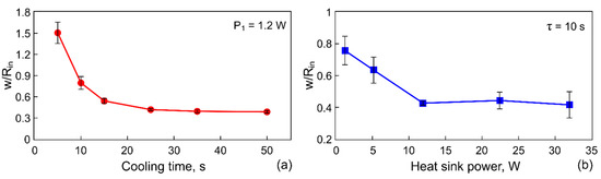 Let us analyze the influence of the surface tension gradients, which are responsible for the formation of the ring-shaped deposit, on the particle arrangement (the distribution) over the ring width. To do this, we introduce the parameter , which represents the ratio of the ring-shaped deposit width, , to its inner radius, . Since the inner and outer boundaries of the deposit are asymmetric, we estimate averaged values as follows: , and using and data calculated by summing the number of pixels (see methods in Section 2.2). Figure 8 represents the dependencies of the parameter on the cooling time span at 1.2 W (Figure 8a), and on the cooling power at 10 s (Figure 8b).