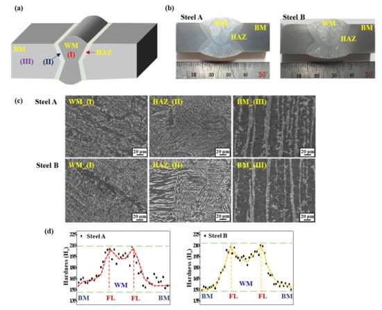 Figure 1 shows the macrostructure, microstructure, and hardness profile of the two welded steel samples. The major differences between the two BMs of the two samples lie in the banding index of pearlite and the level of the 2nd phase particles, which was reported previously [20], but they were not the focus of the present study. Under the same welding conditions and consumables, however, there was no significant difference in the macro- and microstructures of weldments of the two samples. The distributions of the hardness profile of the two welded samples showed a similar pattern: the highest and lowest hardness values were measured around the fusion lines and the BM, respectively.