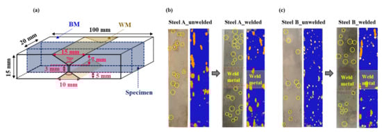 (a) Schematic diagram showing the dimensions of welded sample for HIC test in reference to NACE TM0284 standard method; ultrasonically detected HICs of the unwelded and welded samples after HIC test: (b) Steel A and (c) Steel B.