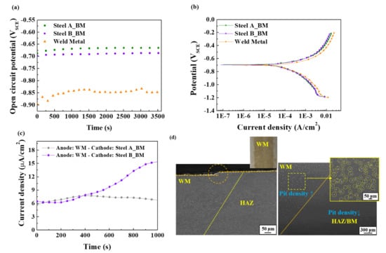 Measurements of (a) OCP, (b) PD polarization, and (c) Galvanic current; (d) Metallographic observation of weld metal in Steel A after an immersion test.