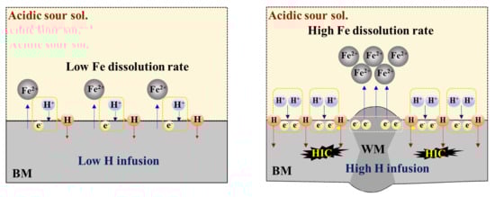 The formation of this type of galvanic couple between the WM and BM in an acidic sour solution leads to more hydrogen reduction (H+ + e− → H) in the BM, resulting in the higher infusion of hydrogen in the BM and more vulnerability to HIC. This process is illustrated schematically in Figure 5.