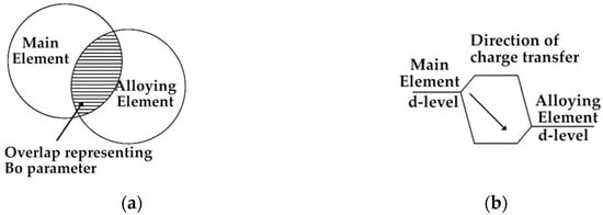 As the composition of the high-entropy alloy usually consists of at least five different elements, its design cannot be based on conventional equilibrium systems. It was found, however, that for Ni [25], Fe [26] and Ti [27] based alloys, the molecular orbitals method can be successfully used to predict and determine their phase structure. The molecular orbital method, called Bo–Md, consists of calculations of two parameters for the main element in an alloy. The Bo parameter (visualization on Figure 1a) is short for bond order and describes the strength of bonding between the main element and the alloying element. The bond order value differs in the case of different crystal structures, as shown on Figure 2. The alloying element has a different number of neighbors in a different distance in the cubic, body-centered lattice (Figure 2a) and is different in the hexagonal close-packed lattice (Figure 2b) Md parameter (Figure 1b), which is short for metal d-orbital energy and connects the electronegativity and atomic radius of the alloying elements together with the main element in an alloy. The energy level in the hybridized bond between the main and alloying element controls the charge transfer direction, so it is related to electronegativity. A higher main element d-level energy (Figure 1b) means that the charge transfer is from the main element to the alloying element. The Md parameter is influenced by the atomic radius [45], so the radius of the d-orbital is increased, and thus its energy level is higher [25]. For calculating both of the parameters for the complex alloy, the formulas shown below are used:
