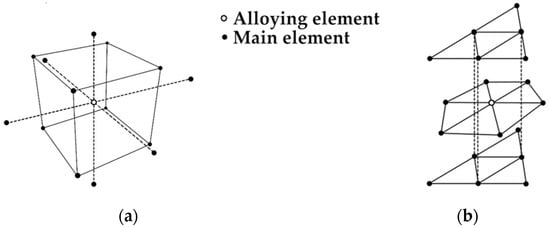 Placement of the main and alloying element atoms in body-centered cubic lattice and (a) hexagonal close-packed lattice (b).