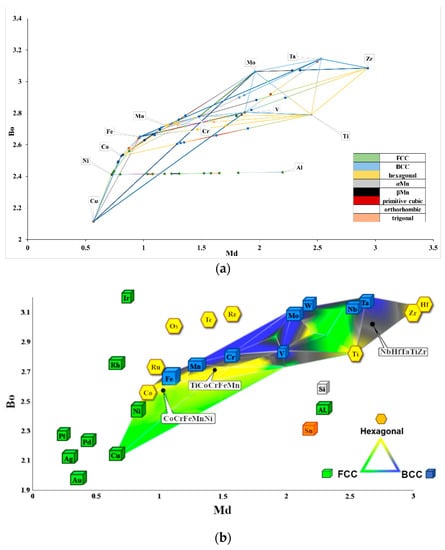 The Bo–Md diagram developed using the molecular orbitals method for elements based on the FCC, BCC and hexagonal lattices together with the position of the designed TiCoCrFeMn alloy in the BCC + hexagonal two-phase area, the Cantor CoCrFeMnNi alloy with the FCC lattice and the NbHfTaTiZr alloy with the BCC lattice [3]; construction lines compatible with double equilibrium systems (a) and the area of dominant phases with BCC, FCC and hexagonal structure (b).