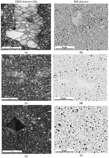 Band contrast maps (BC) made with the EBSD technique enable us to visualize areas of low contrast, such as the grain boundaries and interfacial boundaries. They allowed us to characterize the microstructure of the material in question as an ultra-fine grained one (Figure 4a,c,e). The sinter matrix consists of grains smaller than 1 µm and local areas of grain size of about 5 µm. These local areas dissolve with the annealing time, rebuilding into a fine-grained structure after a long homogenization period of 1000 h. On the other hand, the observations performed by using the backscattered electron (BSE) detector (Figure 4b,d,f) were found as sensitive to changes in the chemical composition of individual phase components. Such an observation revealed that the grain structure of the alloy consists of grains significantly different in contrast, which proves that the assumed two-phase structure was obtained. Therefore, taking into account the grain size and differences in contrast, and in order to clearly describe the analyzed areas at this stage of work, the following nomenclature was used: