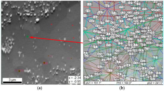 The microanalysis of the chemical composition in the individual phase regions showed that the bright regions, both the ultra-fine-grained in the two-phase zone and in the local single-phase microregions, mainly consist of elements with a crystalline BCC lattice-based structure (Cr, Fe, Mn). On the other hand, in the grey areas, a noticeable increase in the content of hexagonal lattice-based elements, i.e., titanium and cobalt were found (Figure 5). This observation suggests that, in accordance with the theory of molecular orbitals modeling (Figure 3), the assumed two-phase sinter structure that was based on the BCC lattice of the solid solution and the hexagonal lattice of the Laves phase was obtained. Nevertheless, in order to identify the crystallographic structure of the observed areas with the different phase contrast, EBSD microdiffraction studies were performed in the areas of “large bright particles” on the basis of the crystal lattice parameters values obtained from the XRD tests. The cross in Figure 6a indicates the area of the analysis in which the electron diffraction was recorded (Figure 6b). The Kikuchi lines shown in Figure 6b were indexed according to the declared lattice parameters. Additionally, red dots indicate the sites subjected to the analysis with the same parameters as these point with a cross. The obtained Kikuchi line system clearly indicates that the bright phase has the structure of a BCC with a lattice constantly oscillating around the value characteristic for the manganese lattice.