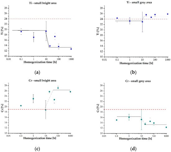 Evolution of the chemical composition of titanium (a,b) and chromium (c,d) in the areas of the two-phase, ultra-fine-grained matrix of the TiCoCrFeMn sinter as a function of homogenization time at 1000 °C.