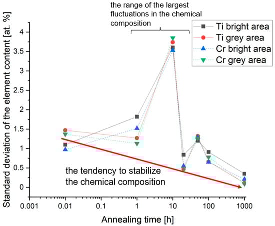 The analysis of the chemical composition evolution has shown that the significant change in the proportion of two basic elements affecting the phase structure of the alloy occurred after 10 h of homogenization at 1000 °C. Such a phenomenon was attributed to the slow diffusion effect, typical for HEA, which is responsible for the high thermal stability of multicomponent high-entropy alloys [3]. An additional confirmation of the largest fluctuations in the chemical composition at this annealing time interval was also shown during the analysis of changes in the standard deviation of the content of individual elements (Figure 8). As could be observed, the general decreasing tendency of the standard deviation in the proportion of Ti and Cr in the two-phase fine-grained matrix volume indicates the stabilization of the chemical composition. Thus, the phase stabilization was effectively disturbed for the homogenization time of about 10 h. This effect, combined with changes in the content of individual elements (Figure 7), indicates that intense diffusion processes leading to the formation of the final structure occurred at a temperature of 1000 °C in the range from 1 to 20 h of annealing.