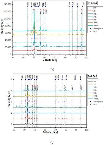 TiCoCrFeMn alloy diffractograms after different annealing times for the two used X-ray wavelengths, Co lamp (a), Cu lamp (b).